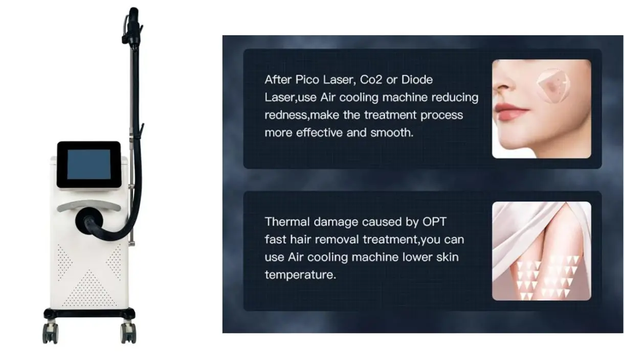 1) Secara berterusan menyampaikan udara penyejuk ke tisu menargetkan, meminimumkan kesakitan dan kerosakan terma semasa rawatan laser dan IPL dan memberikan kelegaan sementara untuk suntikan kosmetik.