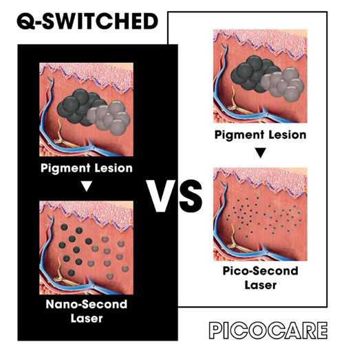 Perbezaan utama antara kedua -dua laser adalah tempoh nadi. Q-switched ND: YAG Laser mempunyai tempoh neneknik nanoseconds, manakala picosecond laser mempunyai tempoh denyut picosecond yang lebih pendek.